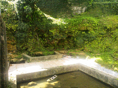 牧港にある湧水。現在でも綺麗な水が湧いており、エビやグッピーなどの生物も見ることができます。
