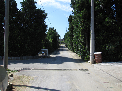新里地区内の集落展望 フクギの防風林