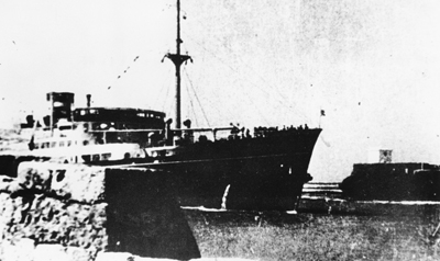 三重城と屋良座城により護られた狭い港口を入港する船