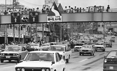 1978年、7月30日。交通法変更を見守る市民たち(泊交差点)