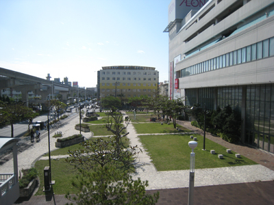 ジャスコ前広場周辺の景観左側がモノレールの軌道、右側ジャスコ。