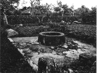 昔、登野城家(トゥヌッキャ)の東の共同井戸(アーラカ)。さんご石で作られたサンカ(桟架)が巧みである