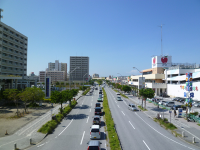 遊歩道橋から新都心のメインストリート天久方面を見降ろす