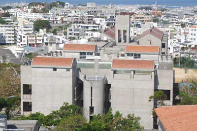 石嶺市営住宅の高層階から石嶺中学校を見ています。赤い瓦と分節されたコンクリート面がとても美しいです。