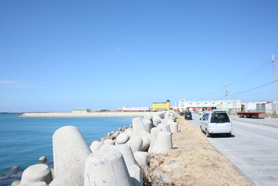 クレーン、コンテナ、テトラポット、トラックが港近くの主な風景