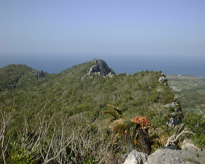 安須杜の頂上から岩山の背と東シナ海を臨む。