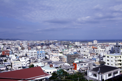 市街地と中城湾を見る