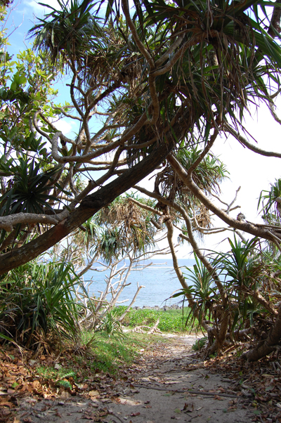 アダンのつくるトンネルの先に海が見える。