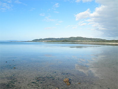 名蔵湾、県道79号線より赤崎、大崎、屋良部岳を観る、左端後方に西表島が観える