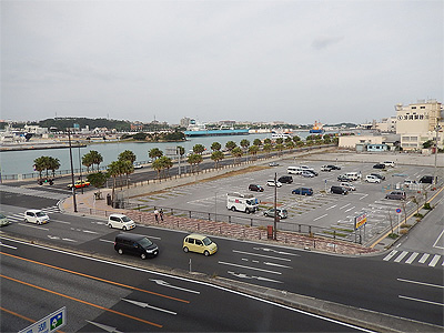 那覇軍港を遠望する。正面の緑はかつて那覇港の管理施設のあった御物城(オモノグスク)跡。