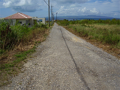 下り坂の一本道と前方に西表島との風景