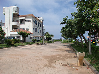 砂辺海岸近くの公園、周辺には複数のダイビングショップ