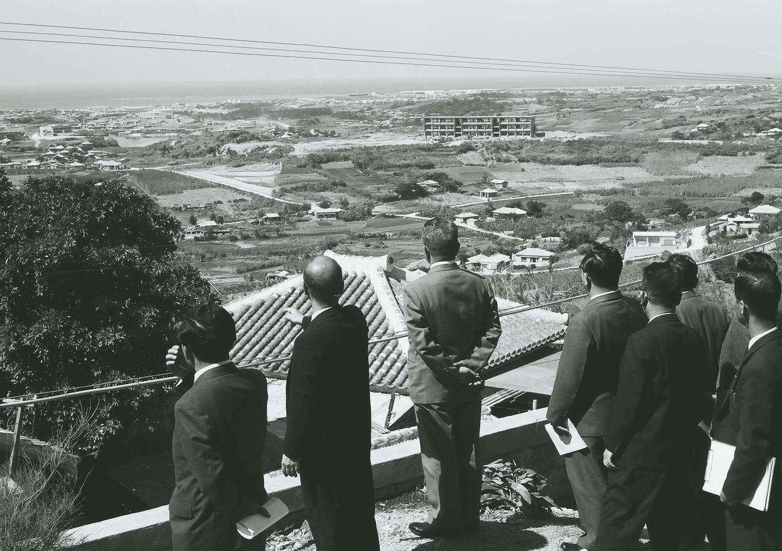 大田政作行政主席視察 首里高等学校 校舎から景色をみる一行