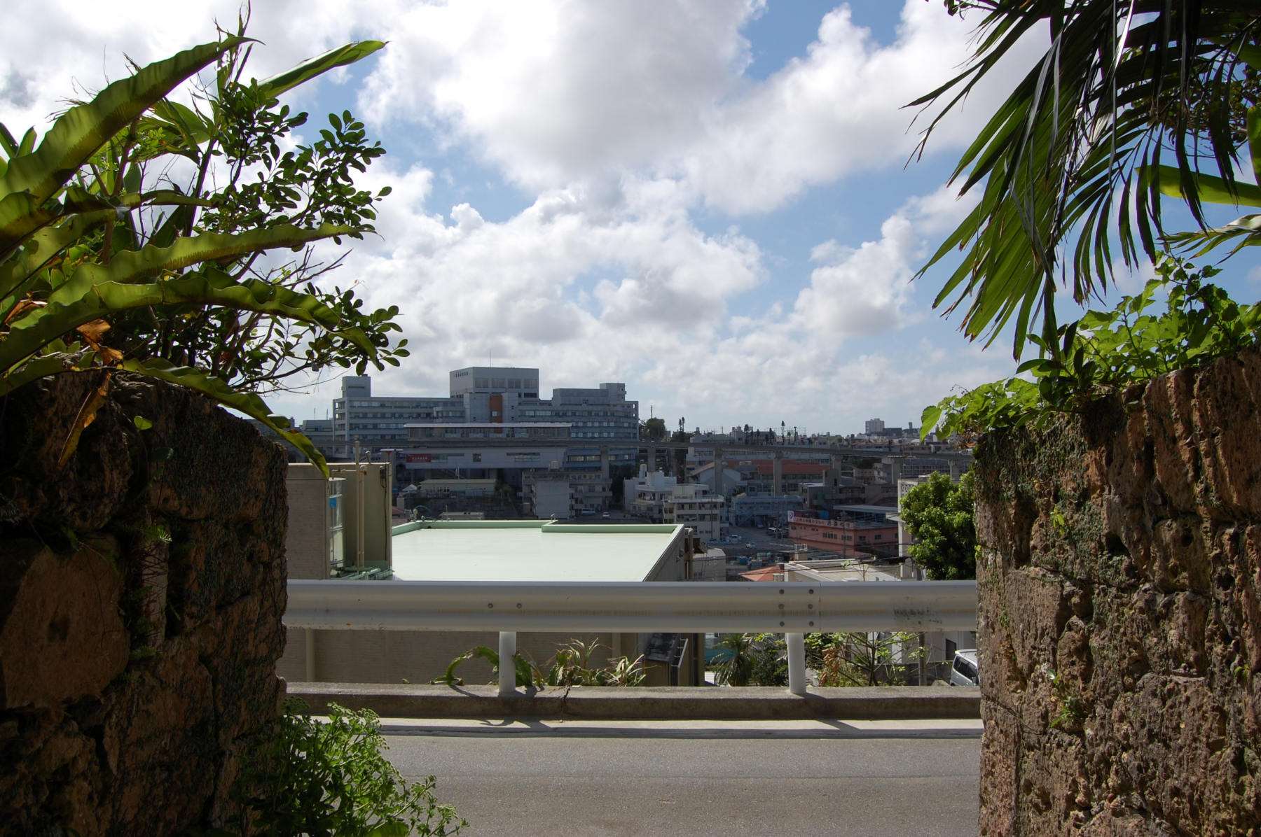 登録有形文化財の登録を受けた民家の塀。沖縄そば屋さんになっている。屋敷入口からの正面に市立病院前駅を望む。