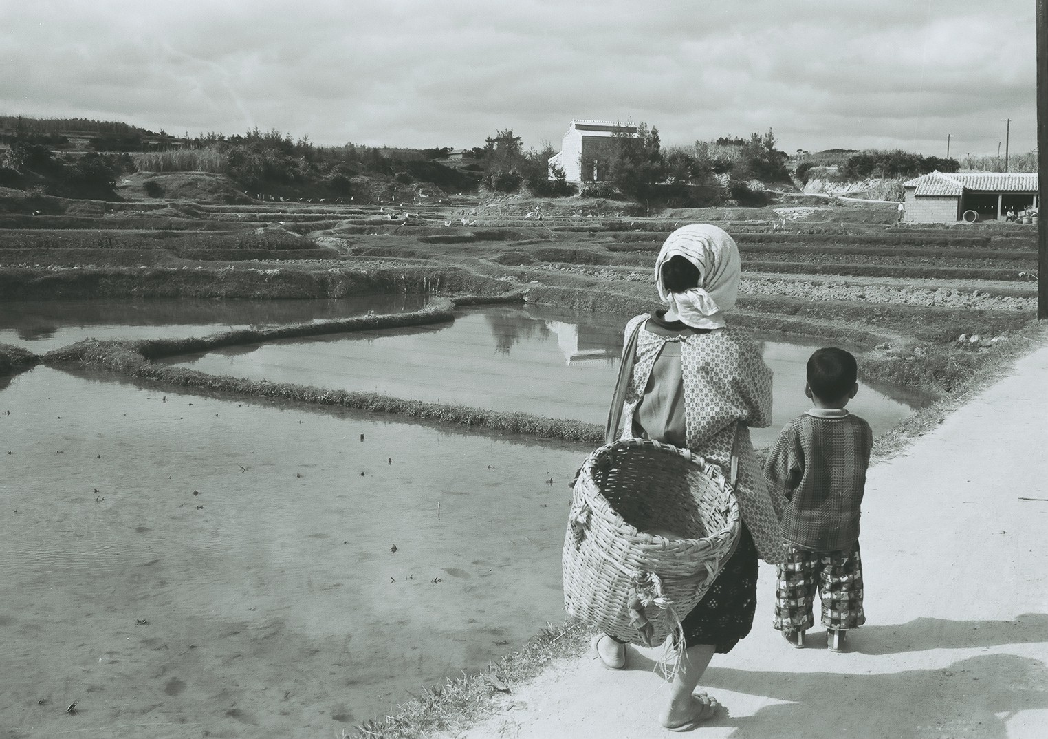 伊是名村 田のそばを歩く女性と子供