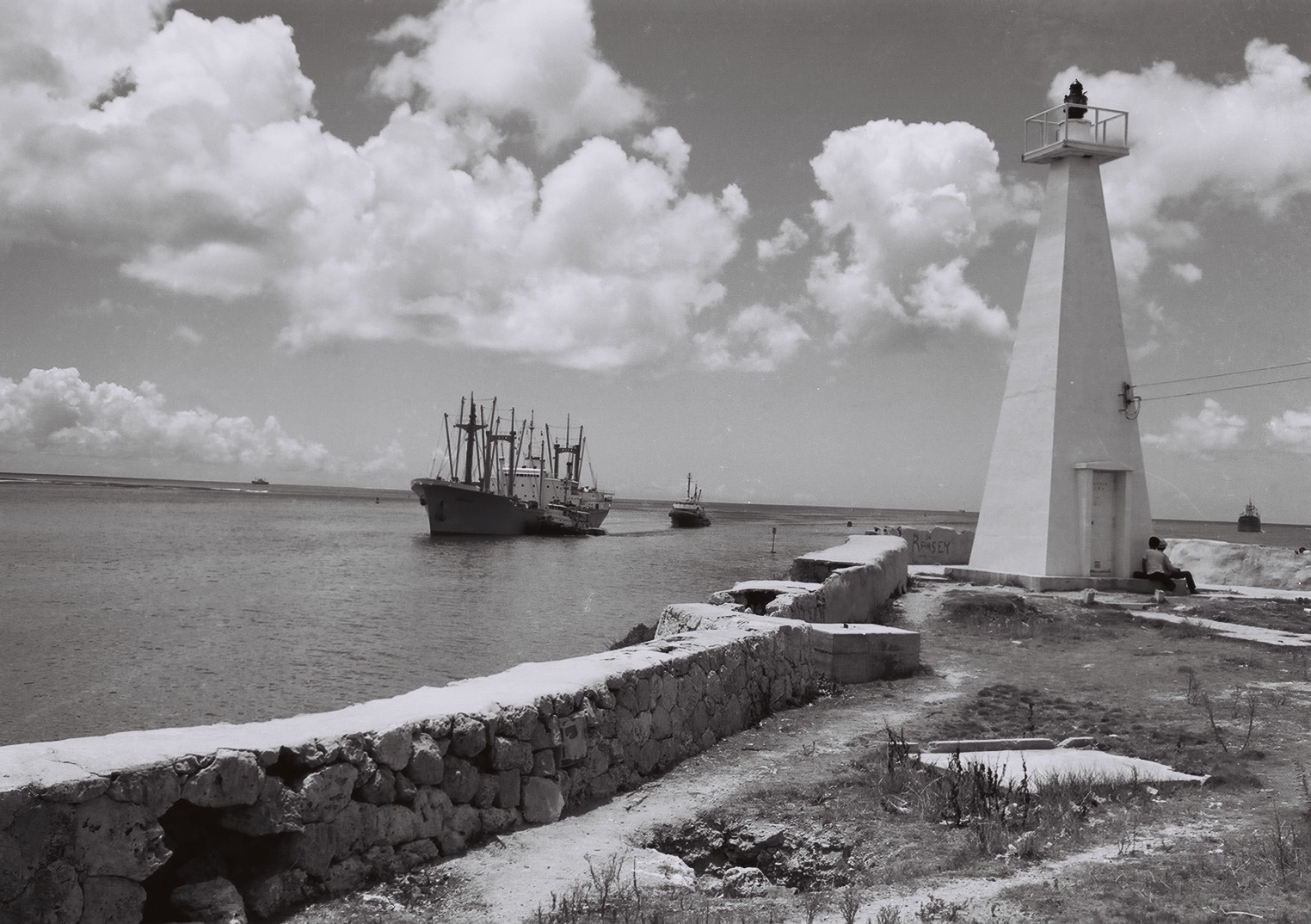 歌のふるさと 那覇 三重城 灯台の傍を通る船