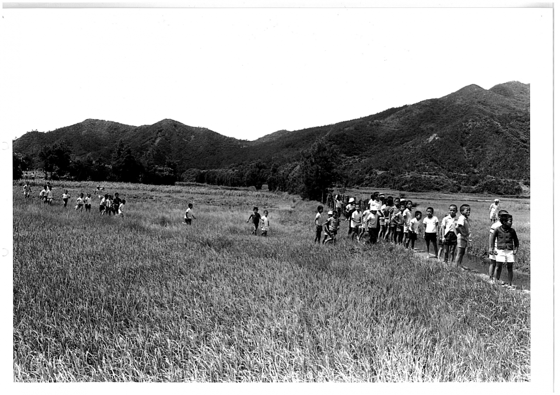 伊平屋島を訪れる高等弁務官。撮影地後ろにはお宮がある。