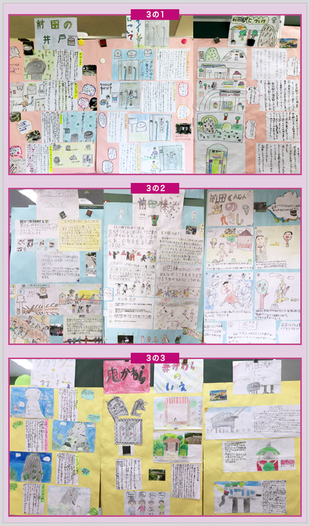 伝統や古い井戸等が残る前田地域の良さやまちの魅力を再発見しようとゲストと探検したり、モノレール車窓から風景を捉えたりした。自らの気づきを振り返りテーマ別にグループ学習を進めて「前田じまん」を工夫してまとめた。