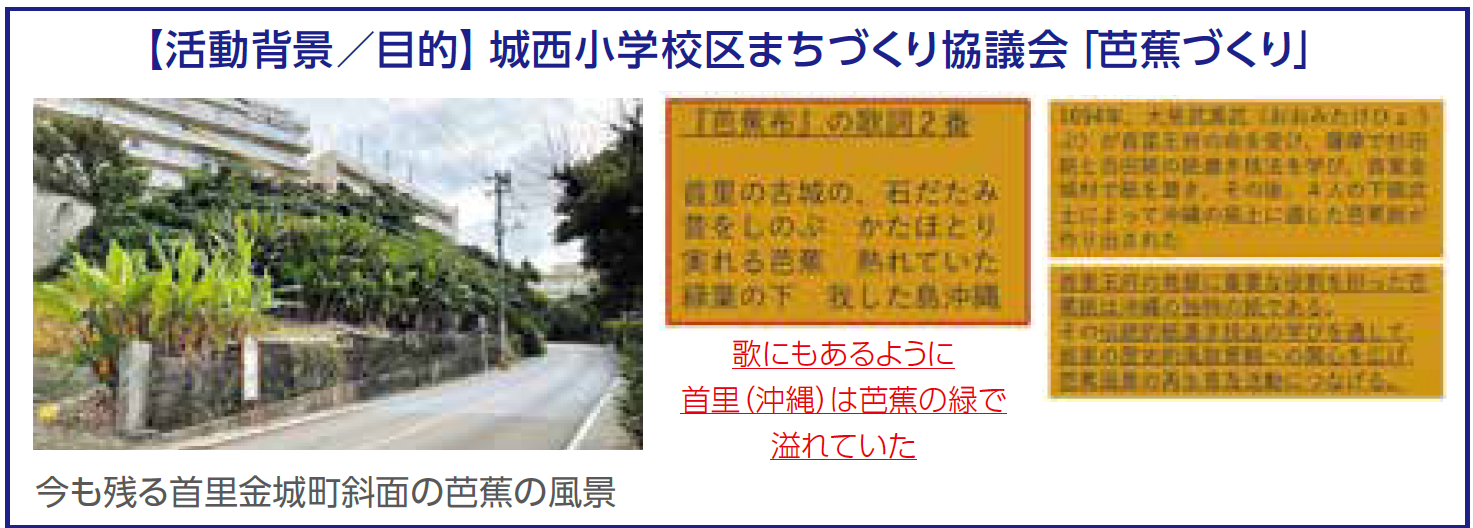 ●芭蕉布の歌詞にあるような緑にあふれる首里の風景を取り戻していくためにも、小学校芭蕉園(敷地)づくりをはじめ地域においても活動目的を共有し芭蕉の植込み活動を展開していくことが望まれます。