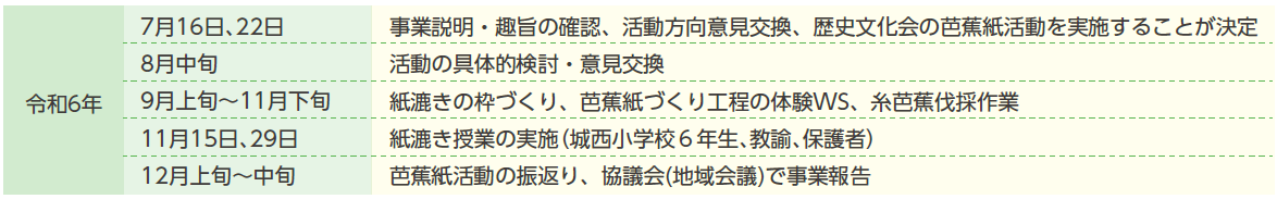 ●児童と保護者が一緒になって芭蕉紙の歴史学習に取組、紙漉き工程を体験し実際に芭蕉紙をつくりあげることができたことで、地元首里への愛着や誇りが増したとともに、また、サポートに関わった人たちも学校や首里地域との連帯感が高まりました。●今後も芭蕉紙の卒業証書づくりが学校伝統行事として継続していけるよう、地域や大学等連携協力の体制づくりが重要です。