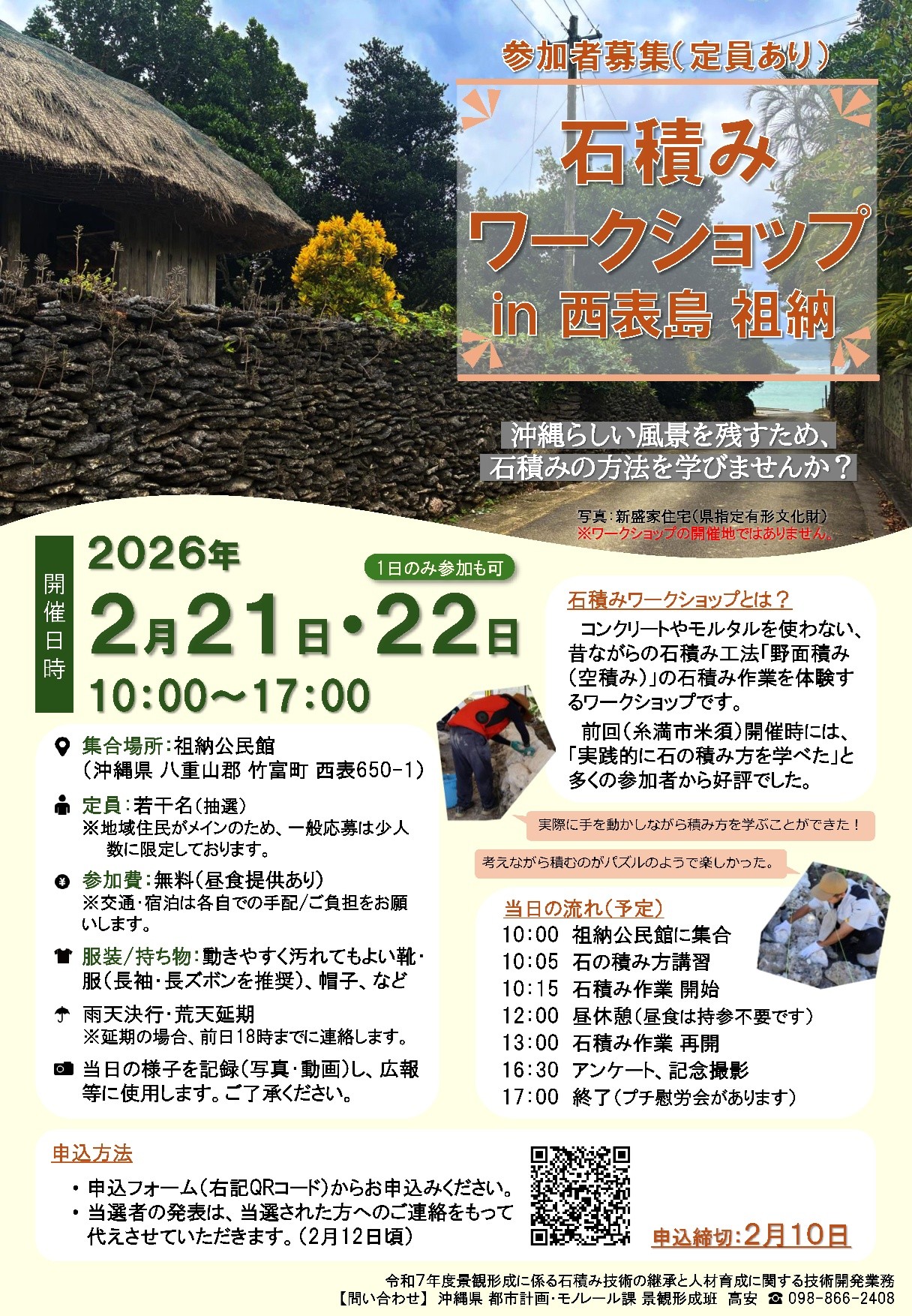 沖縄県では、令和7年度景観形成に係る石積み技術の継承と人材育成に関する技術開発業務として、「石積みワークショップ(西表島 祖納地区)」を開催します。 石積みワークショップとは、コンクリートやモルタルを使わない、昔ながらの石積み工法「野面積み(空積み)」の石積み作業を体験できるワークショップです。